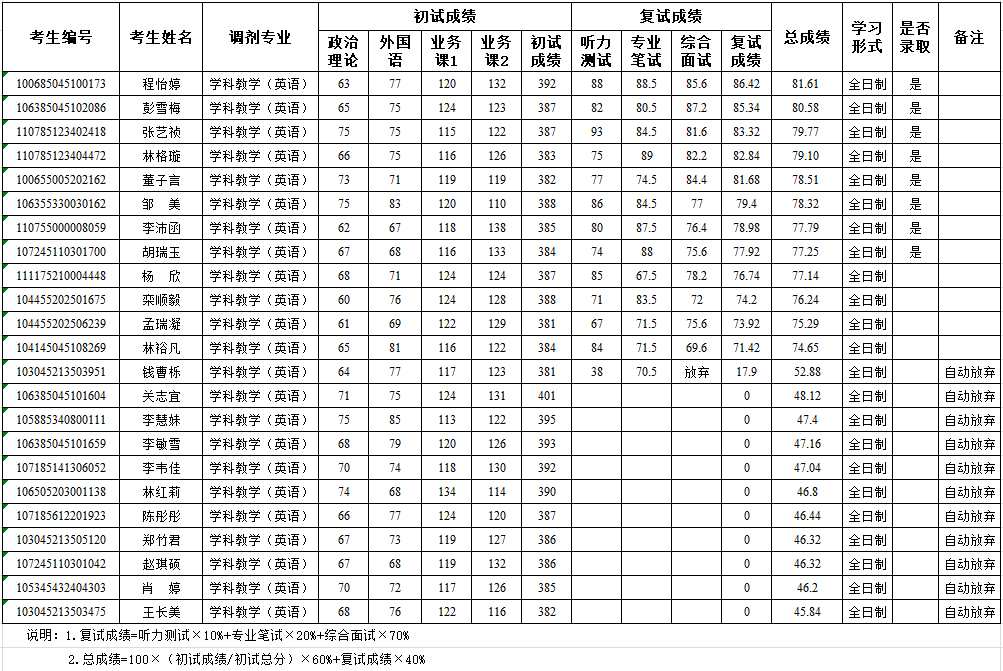 九游会国际外国语学院2025年硕士研究生调剂考生成绩及拟录取情况公示--学科教学(英语)