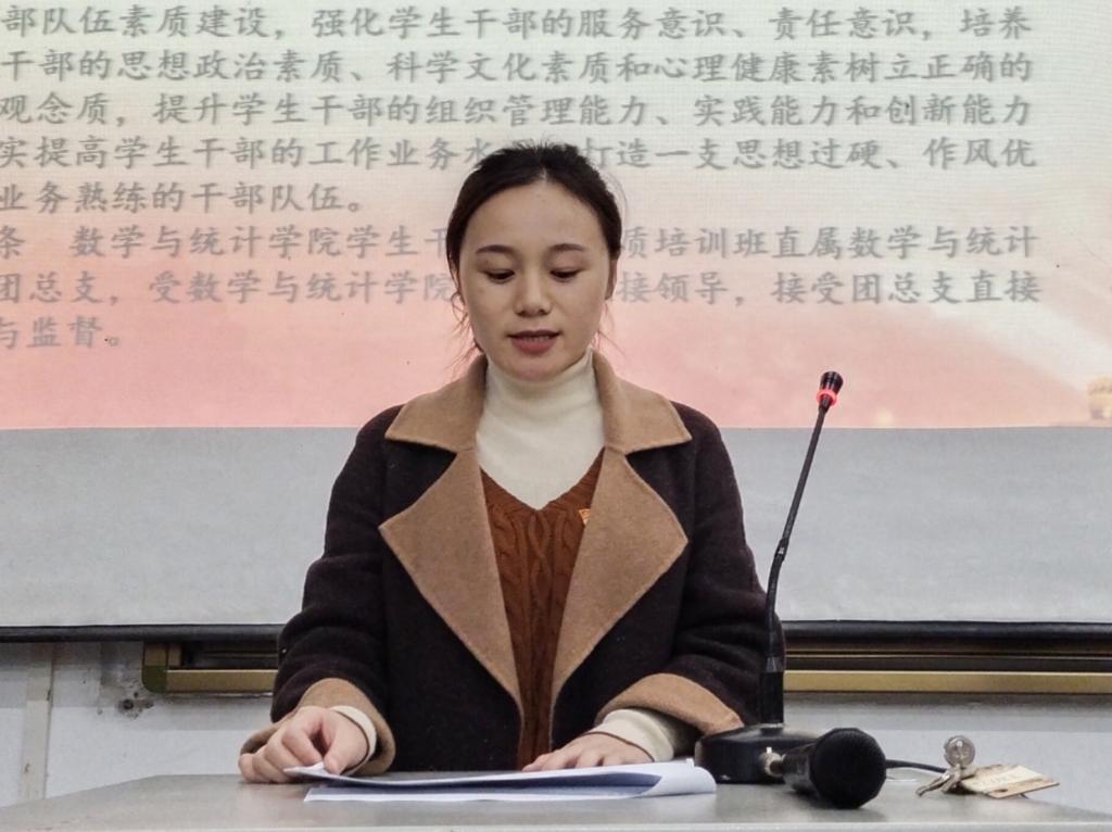 典礼伊始,主持人介绍出席老师,宣布开课典礼正式开始,全体起立,奏唱团歌。紧接着,黄老师宣读《九游会国际数学与统计学院学生干部培训班章程》,刘老师宣读《九游会国际数学与统计学院学生干部培训班管理办法》。两位老师提醒同学们要密切配合团学工作,服从安排,在干训中认真学习备考,遵守课堂纪律。开课典礼结束,各位老师有序离场。