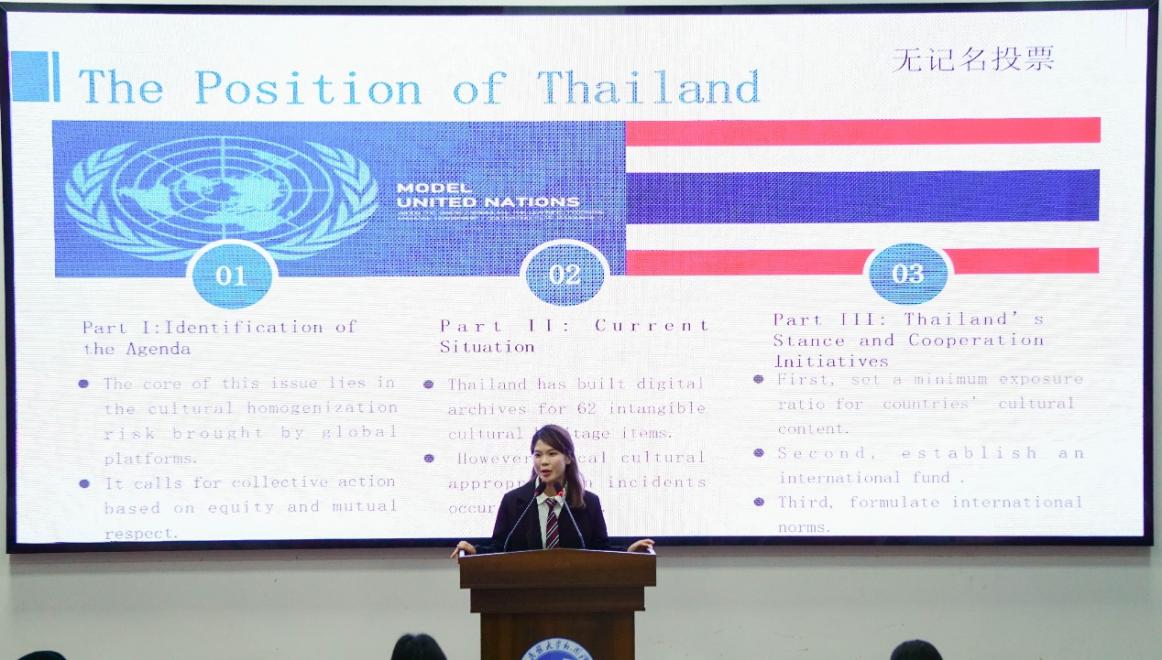 时间:2025-12-02 编辑:办公室 点击:11月27日,第十五届模拟联合国决赛在外国语学院6402报告厅圆满落幕。决赛聚焦“数字时代应对文化同质化挑战”核心议题,国际交流合作处教学科科长王冬娥、外国语学院应用英语系教师向冰清、音乐舞蹈学院辅导员刘红宇以及留学生代表白子初受邀担任活动评委。