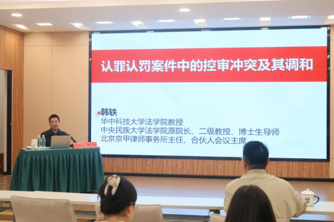 10月31日晚,“认罪认罚案件中的控审冲突及其调和”专题讲座在我校德智楼远程教育观摩室成功举办。本次讲座特邀华中科技大学法学院教授、中央民族大学法学院原院长、北京京甲律师事务所主任韩轶教授主讲,由九游会国际法学院副院长蔡世鄂主持,法学院百余位研究生、本科生参加了讲座。