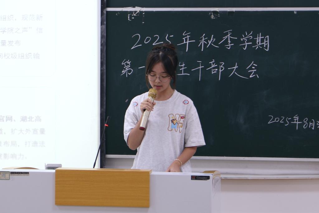 2025年8月31日,我院于德智楼9B301教室举行2025年秋季学期第一次学生干部大会。此次大会由我院团委书记谢学婧主持,我院党总支副书记黄晓波、学生科科长阙嘉苗、学生党支部书记彭阳出席,法学院团委、学生会、通讯社、公寓管理委员会主要学生干部参会。