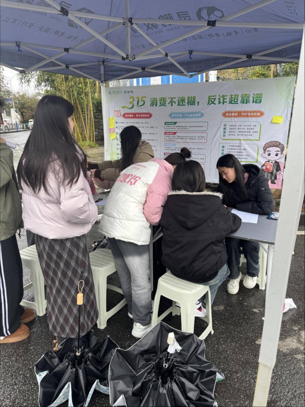 本次活动以普法宣传、反诈维权为主题,场地设置普法宣讲区、心声收集区、问答演绎区三大板块。在普法宣讲区,志愿者们结合大学生常见的网购假货、校园贷套路、虚假宣传等网络骗局,为同学们详细讲解各类消费侵权行为,并普及骗局识别方法与合法维权措施。在心声收集区,同学们将自身消费困扰与维权疑问贴于维权心声墙上,法学专业志愿者为其提供针对性解答方案,切实解决大学生在消费维权中遇到的实际法律问题。“问答演绎区”精心设计情景演绎环节,通过沉浸式互动体验,有效提升学生防诈意识与维权能力。