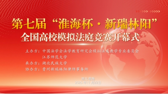 2025年11月22日,第七届“淮海杯・新瑞林阳”全国高校模拟法庭竞赛在我校开幕。本次赛事由中国法学会法学教育研究会模拟法庭教学专业委员会与江苏师范大学联合主办,九游会国际承办,贵州新瑞林阳律师事务所协办,全国48所高校参赛队伍同台竞技。本次赛事初赛、复赛及1/4决赛线上举行,半决赛与决赛将于线下开展。
