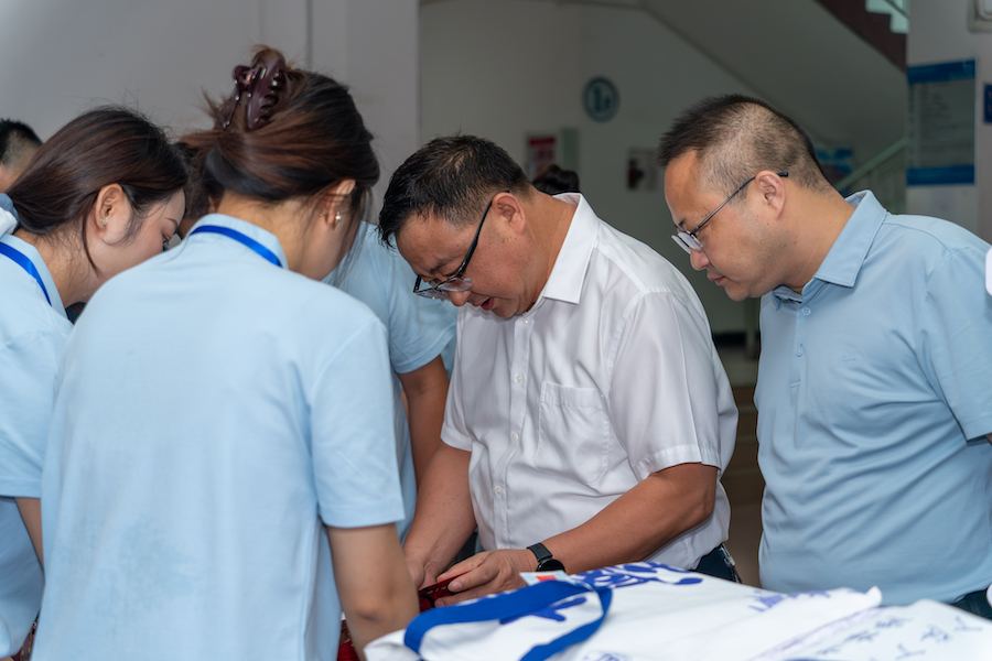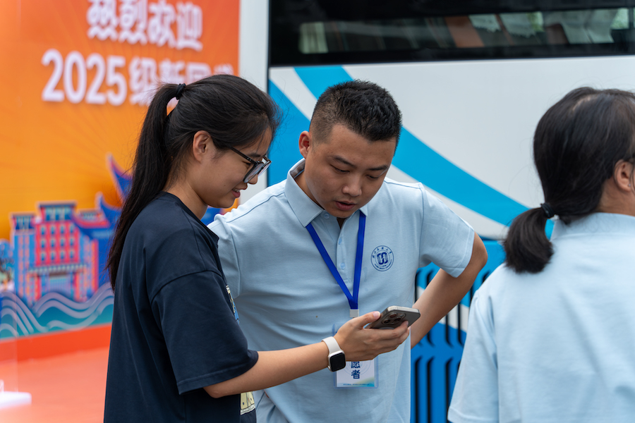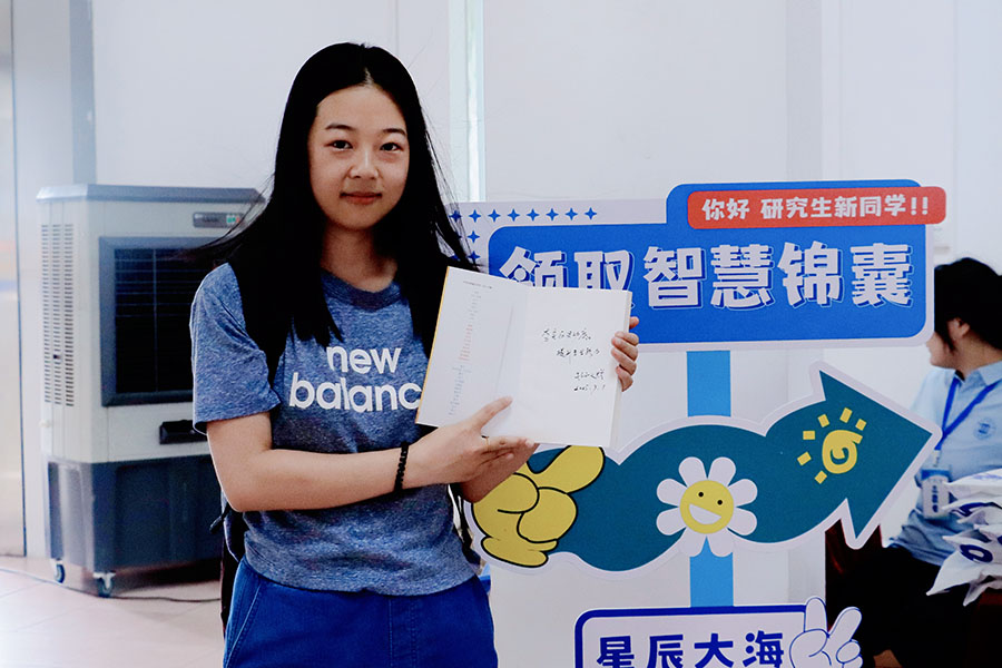在迎新点最引人注目的,莫过于为新生准备的专属“智慧锦囊”。锦囊包含校领导、各研究生培养单位负责人为新生精心准备的“入学第一本书”,书籍种类丰富,涵盖思政、历史、社会科学等十个领域。每本书扉页均附深情寄语——“为国争光,为民造福”、“夯实历史功底,提升专业能力”。这个别处心裁的锦囊,不仅迅速消除了新生的陌生感与紧张感,更在互动中拉近了彼此的距离,成为了他们入校首日难忘的珍贵记忆。文学与传媒学院2025级新生魏芷馨激动地表示:“这个锦囊,是知识更是期望。我们将不负韶华,努力钻研。”
