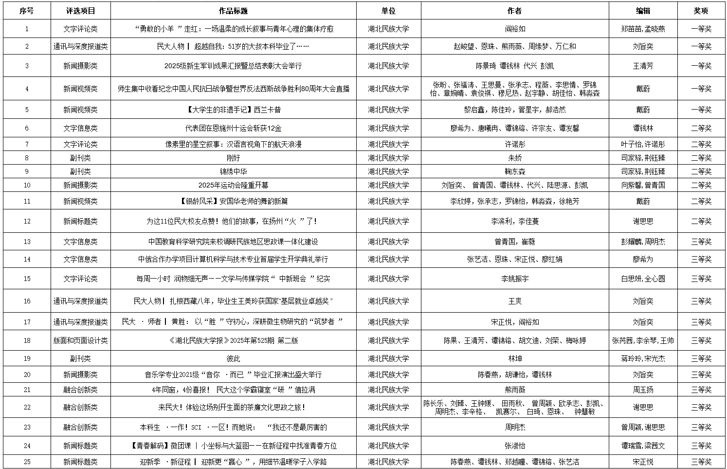 据悉,湖北高校新闻奖由湖北省新闻工作者协会高校分会组织评选,是全省133所高校新闻宣传领域的权威专业奖项。该奖项旨在鼓励高校新闻工作者积极创作优秀新闻作品,推动高校新闻事业发展。此次参评湖北高校新闻奖,代表学校在与全省高校同台竞争的激烈比拼中,集中展示了民大新闻宣传工作成效,进一步传播了民大故事,树立了社会形象。