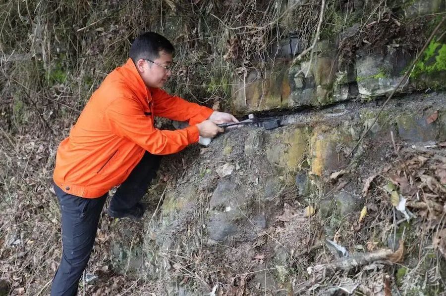 李明龙在野外进行地质剖面测量和采样