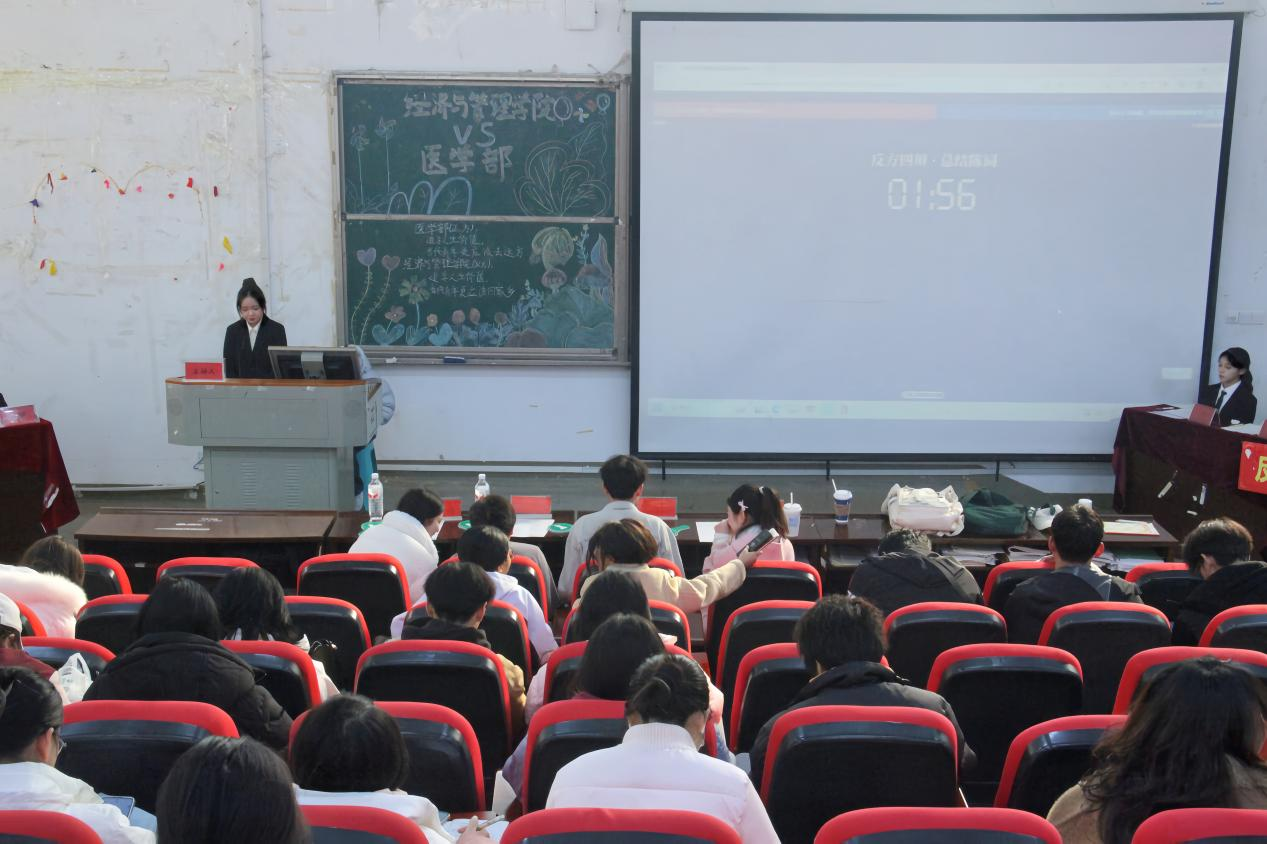 本网讯(见习记者 孟可欣 佘思咏 刘晨怡 张玉楠 杨丹妍 任姚奕/文 王朝军/图)2025年11月30日,经济与管理学院学生会与医学部学生会联合举办的友谊辩论赛在修远楼5B403报告厅举行。医学部优秀辩手庞震、陈扬,经济与管理学院优秀辩手徐涵昭、易泽铭应邀出席本次比赛并担任评委。最终,正方三辩张雅莉与反方一辩刘桔交荣获“优秀辩手”称号。