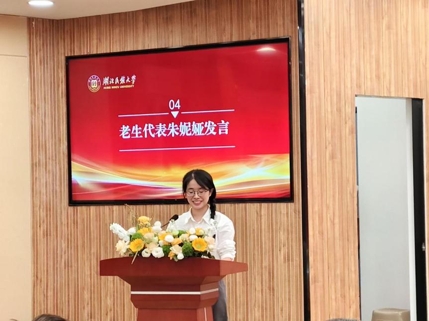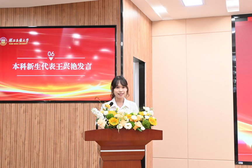 研究生行业导师、本科生行业导师代表,恩施市教学研究和教师培训中心主任向彪上台发言,对新生提出三点期望:一是胸怀家国,立“教育强国、育才报国”志向,担师范教育使命,融个人追求于民族复兴;二是脚踏实地,练“学高为师、身正为范”能力,扎实掌握素养与技能,顺应时代要求;三是坚韧前行,铸“破茧成蝶、久久为功”精神,以终身学习应对挑战,实现人生价值。发言最后,向彪主任即兴赋诗一首:“欣逢金秋丹桂香,开学宣誓铸梦想。良好风貌慨而慷,展望未来今胜昔。宜将精力继学习,不要辜负好时光。师生携手齐努力,共襄民大新辉煌”,为新生送上美好祝福。