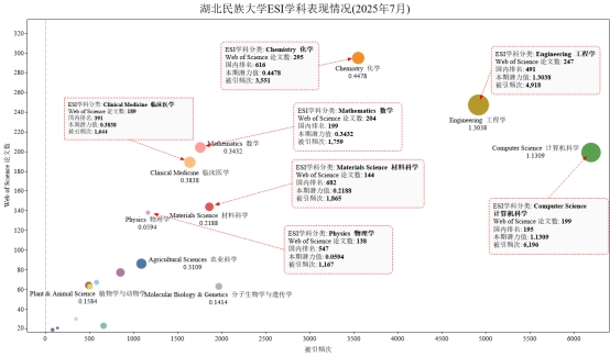图3 我校入围ESI学科前1%学科分布全球排名和发文量情况