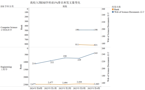 根据基本科学指标数据库(Essential Science Indicators,简称ESI)2025年7月10发布的最新数据显示(2025年7月10日更新,数据涵盖10年2个月:2015年 - 2025 年4月),本期共有9845家研究机构进入ESI全球前百分之一,本期共有9845家研究机构进入ESI全球前百分之一,我校共有2个ESI学科进入全球前1%,如图1和图2所示分别是Engineering工程学和Computer Science 计算机科学。