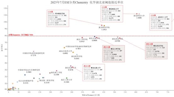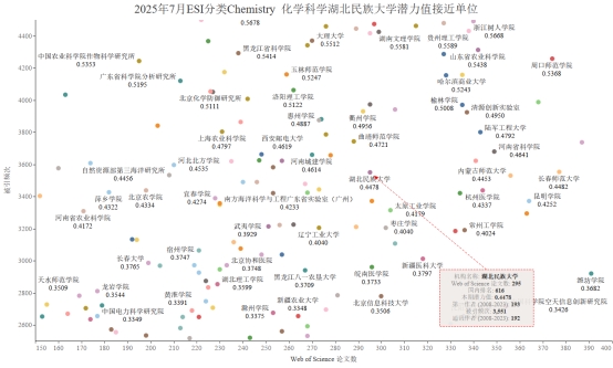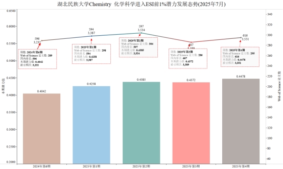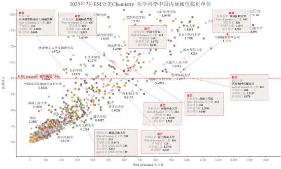 本期我校有望进入ESI前1%的学科Chemistry化学学科,潜力值为0.4478,论文数295,引用量3551,本期入围阈值7930。