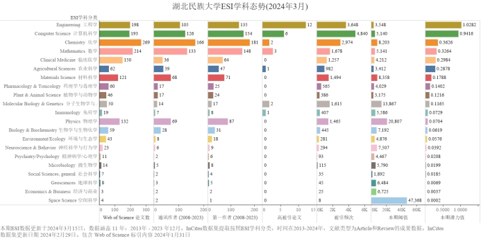 本期我校ESI学科分类数据来看,发文量最多的学科为Chemistry 化学269篇,引用量最高的学科为Computer Science 计算机科学4840,潜力值最高的学科为Engineering 工程学1.082。由于潜力值比实际略有偏高,尽管本期潜力值大于1,我校ESI分类Engineering 工程学本期尚未进入ESI学科前1%。