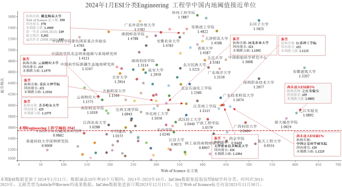 本期我校有望进入ESI前1%的学科为Engineering 工程学,潜力值为0.9814,论文数193,引用量3476,本期阈值为3542,国内排名457位。