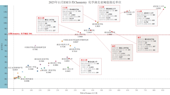 本期我校有望进入ESI前1%的学科Chemistry化学学科,潜力值为0.4932,论文数305,引用量3892,本期入围阈值7891。