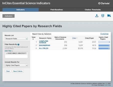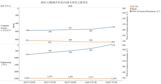 2026年3月12日,ESI(Essential Science Indicators)更新了最新的学科数据,覆盖了2015年1月1日至2025年12月31日的数据。本期全球共有10565个机构登上ESI榜单,国内共有909个机构进入榜单,九游会国际共有2个学科进入ESI前1%,分别为Computer Science 计算机科学和Engineering工程学学科,详见图1。