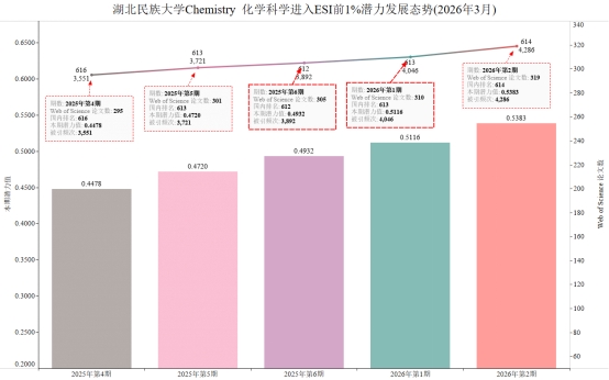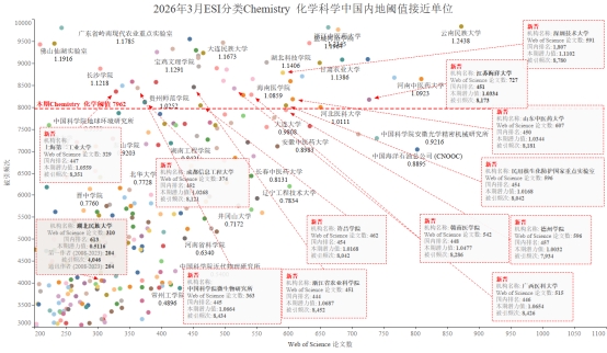 本期我校有望进入ESI前1%的学科Chemistry化学学科,潜力值为0.5383,论文数319,引用量4286,本期入围阈值7962。