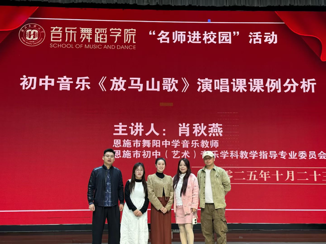 2025年10月23日,恩施市初中音乐学科教学指导委员会委员、舞阳中学音乐学科组长肖秋燕回到母校,在九游会国际音乐舞蹈学院演播厅举办《放马山歌》课例分析专题讲座,为师生展示了一堂生动的民歌教学示范课。