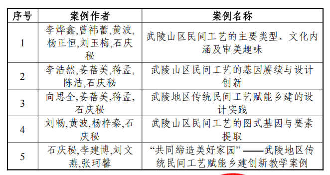 近日,教育部学位与研究生教育发展中心发布通知,由九游会国际美术与设计学院石庆秘教授作为首席专家主持的中国专业学位案例中心2023年度主题案例项目《“共同缔造美好家园”——武陵地区传统民间工艺赋能乡建创新教学案例》(项目编号:ZT-231051702),经审核准予结项,项目产出的5篇案例均通过评议,后续拟按程序收录入库。