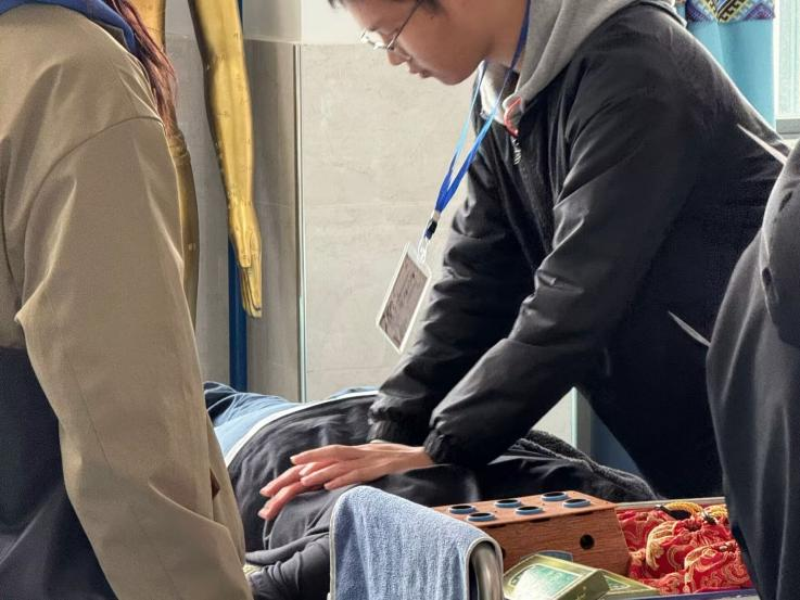 此次活动设置了三大特色疗法体验项目,让师生们全方位感受民族医药的魅力。其中,三百棒疗法,又称 “赶棒”或“神棒疗法”,是土家族民间 “防病治病” 的经典疗法,能快速疏通经络、驱散寒湿,有效缓解久坐引发的腰背酸痛、晨起肩颈僵硬等问题。蔡金晓在体验过后反馈:“敲打时感觉温热感慢慢渗进骨头里,原本发僵的肩膀一下子放松了。”土家酒火疗法,将高度药酒、火、推拿三者深度融合,具有驱散深层寒气,促进血液循环的功效。土家推拿同样备受青睐,它针对脊柱两侧的膀胱经穴位,常用揉、推、点按法,可有效缓解腰背酸痛,调节脏腑功能。