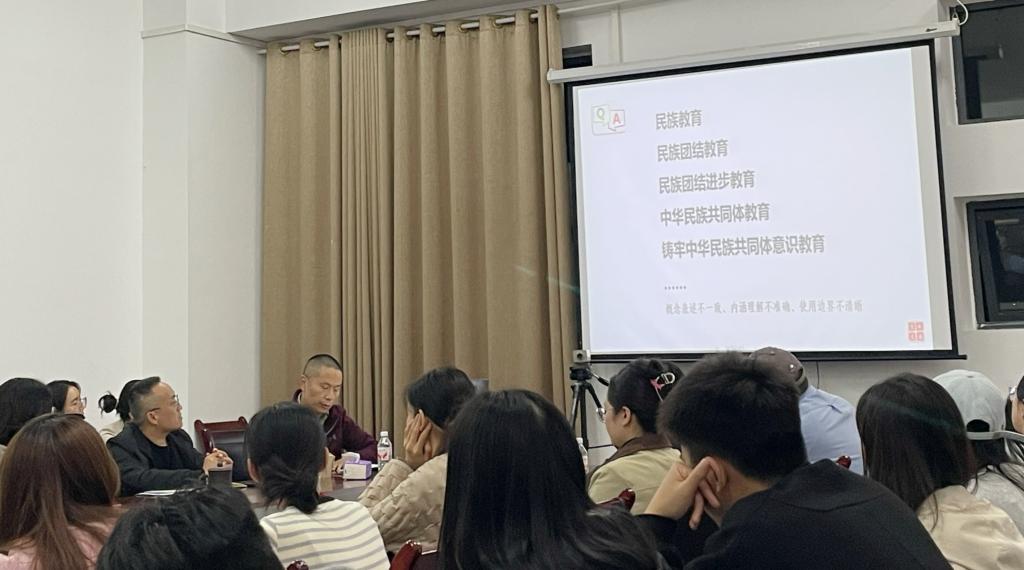 裴圣愚教授以民族研究中多种概念表述不一致、使用边界不清晰等问题为切入点,深入浅出地梳理各概念的产生与演变过程。裴教授凭借深厚的学术积淀和生动的生活实例,引导师生意识到民族团结进步教育、铸牢中华民族共同体意识教育的重要性。互动环节,同学们踊跃提问,就学术困惑和研究思路与裴教授交流探讨。