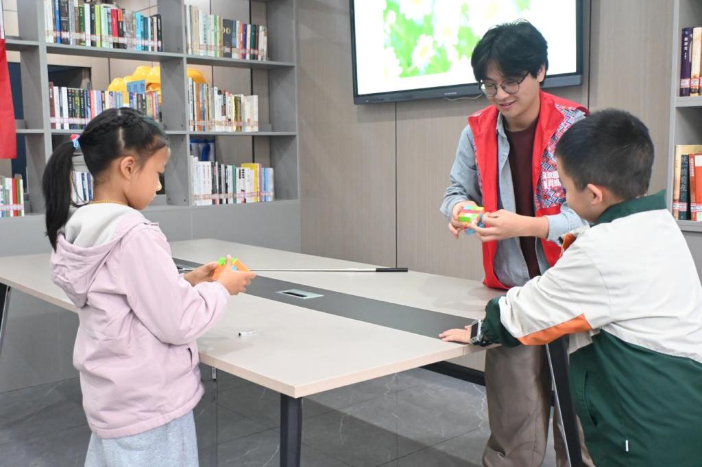 志愿者先展示三阶魔方速拧,几秒复原的操作瞬间点燃好奇。随后拆解“十字打底”“层先法”等技巧,手把手带孩子转动拼接,引导观察色块规律——手眼协调在实操中锻炼,抽象的数学逻辑与空间思维也变得可触可感,不少孩子完成首面拼接时,都会举着魔方兴奋展示。
