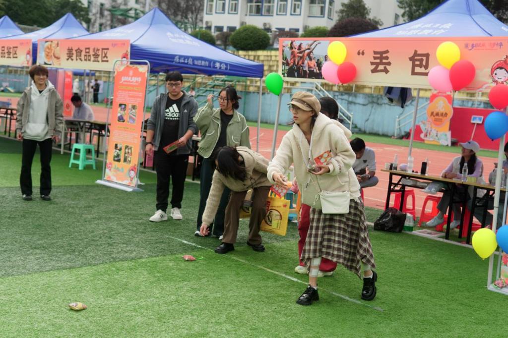 最后,“踏节而跃·壮乡欢舞”将活动推向高潮。该项目源于广西壮族“三月三”的竹竿舞,12~20人分持竿、跳竿两组。8人持4竿呈“田”字,按“开合、开合、开开合”节拍摆竿,4~10人组队跃动,连续完成3组节奏得3分,做“稻穗”手势额外加分,5分钟的限时比拼中,失误可重试。现场竹竿开合声与同学们的欢笑声交织共鸣,既展现了壮乡庆收的欢腾景象,更传递了团结协作的精神内核。