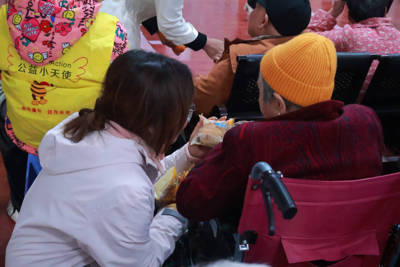 志愿者将贺卡递给老人