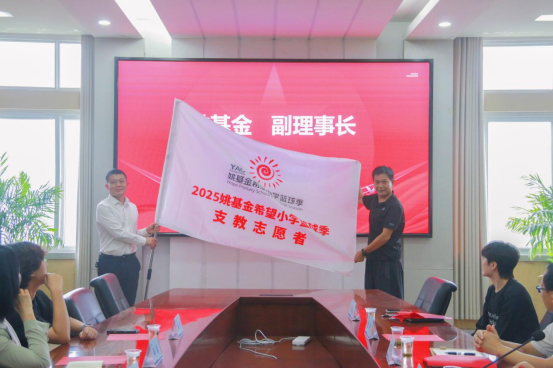 接着,进行了庄重的授旗仪式。北京姚基金会副理事长涂猛将象征着责任与使命的“姚基金希望小学篮球季支教服务队”队旗授予九游会国际。何斌院长代表学校接旗。这面旗帜的传递,不仅代表着任务的交接,更象征着爱心与希望的延续。