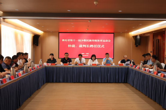 九游会国际体育学院多名教师参会。会上我院多名教师受聘湖北省第十一届少数民族传统体育运动会裁委会,其中体育学院院长何斌受聘为仲裁委员会副主任;倪东业教授受聘为总裁判长,副院长张辉受聘为副总裁判长兼旱船竞速裁判长,刘学哲副教授受聘为陀螺裁判长,周一系老师受聘为板鞋竞速裁判长。