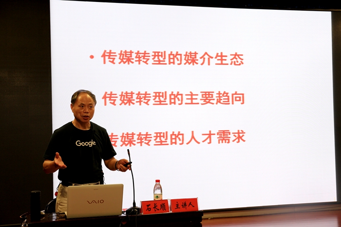 华中科技大学广播电视与新媒体研究院院长、湖北省新闻传播教育学会会长、博士生导师石长顺教授作“传媒转型发展与传媒人才需求趋向”学术讲座