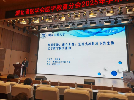 2025年12月6日,湖北省医学会医学教育分会2025年学术年会在湖北医药学院隆重召开。本次年会以“数字化时代医学教育智能化转型与创新路径”为主题,汇聚了来自全省医学高校的100余位教育领域专家学者及医学教育工作者齐聚一堂,共同探讨医学教育发展的新趋势、新挑战与新实践。出席会议的领导和专家包括:华中科技大学原党委副书记、教育部医学教育专家委员会委员、湖北省医学会医学教育分会第七届主任委员马建辉,湖北省医学会医学教育分会副主任委员、武汉大学中南医院原党委副书记余祥庭,湖北医药学院原党委书记、湖北省医学会副会长涂汉军,湖北医药学院党委副书记、校长罗杰等。医学部生物化学教研室主任刘国强副教授作为学校代表应邀参会,并作题为《智链进阶,融合升维:生成式AI驱动下的生物化学教学模式重构》的大会报告。