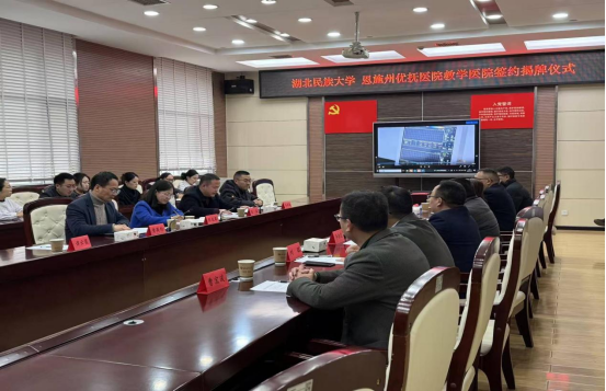 恩施州优抚医院,作为一所肩负着特殊使命的三级公立医院,始终秉承“优抚、奉献、精医、厚德”的宗旨,其不仅关注疾病的治疗,更关注心灵的抚慰和社会的和谐,将为九游会国际医学生提供实践平台与教学案例。九游会国际则依托学术底蕴、科研能力及规范化人才培养体系,为州优抚医院学科建设、诊疗技术提升和人才梯队优化注入动力。双方将重点围绕精神卫生、康复护理、心理服务等领域,构建“教学相长、医研互促”的发展机制,推动教学医院建成区域医学教育、技术服务与科研创新平台。为共谋长远发展、互惠共赢,双方代表共同签订了友好合作协议,并进行了揭牌仪式。